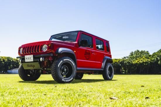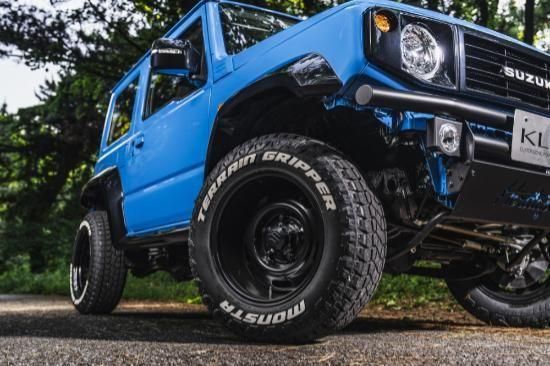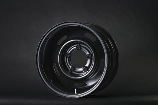 鉄チンホイールといえばノーマルリムの2ピース構造というのが普通。世の中に出回っているジムニー向けの鉄チンも同様なのだが、そんな常識を覆すのがKLCヘリテージの「ワイドホイール」。ノーマルリムとは逆の組み方、つまりフルリバースリムの2ピースを採用しているのが最大の見どころ。よってアウターリムにノーマルリムのような段はなく、ディスク取り付け部からフランジまでストレートに立ち上がるスタイルとなっている。そしてこの「ワイドホイール」は、8.0Jマイナス20というシエラ/ノマド向けとしても規格外ともいえるスペック。ただでさえリムの深さは強烈なのに、フルリバースリムの視覚効果によってさらにディープに、ダイナミックに。まさにバケツのような深さで魅せる。ディスクはナットホールまわりを丸く膨らませた鉄チンらしい造形で、その外側には5つの丸い長穴を均等配置したシンプルなデザイン。カラーもややマットなセミグロスブラックのみ。飾り気を抑えることでリムの存在感を際立たせる仕掛けである。ノーマル車両にノーリスクで履かせられるようなサイズではないが、決まれば最強。圧倒的な深さとワイド感、それを活かし切るフルリバースリム仕様で、チャレンジャーたちを待ち受ける。